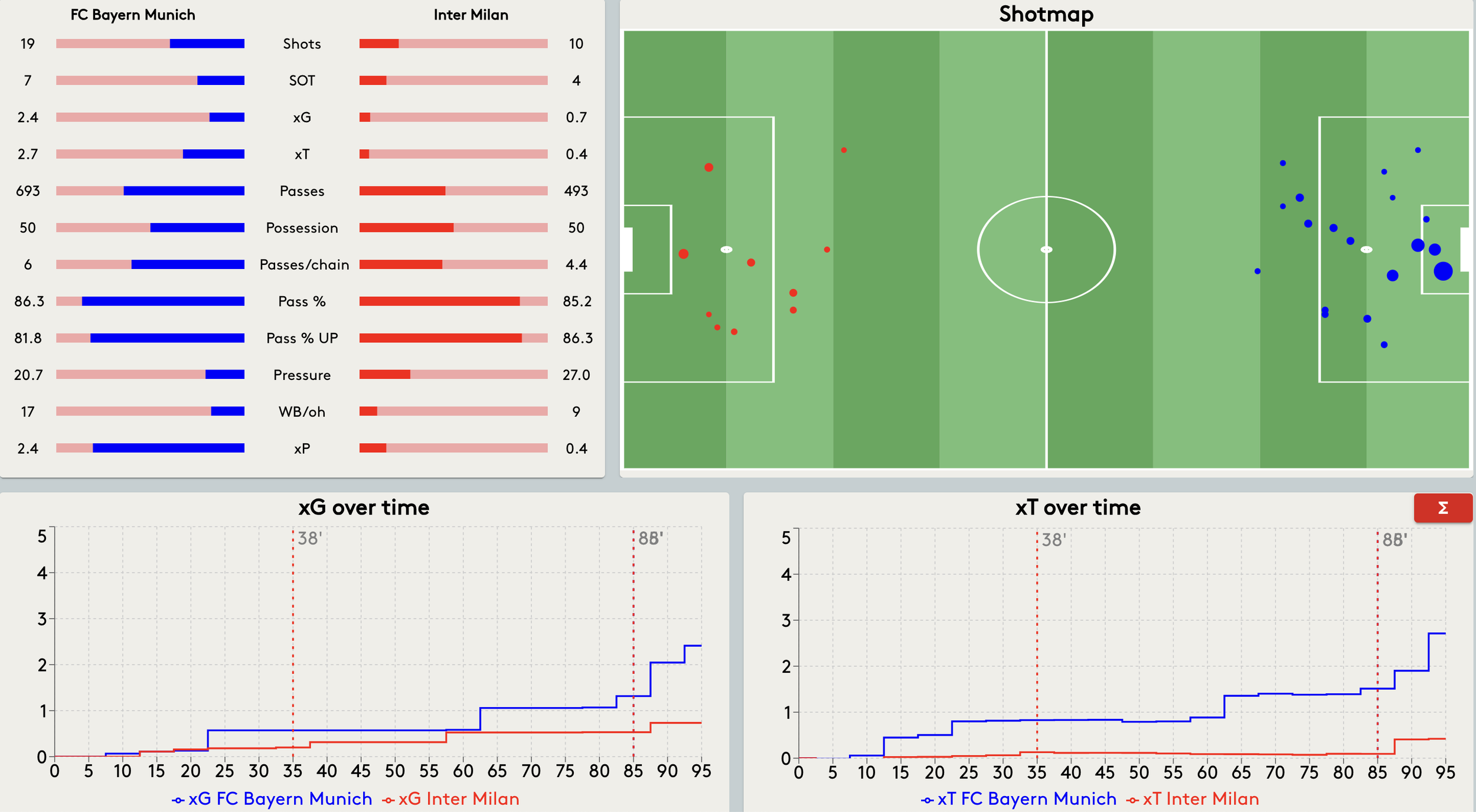 Shotmap: Bayern had far more dangerous looks; Inter’s were efficient and well-timed.